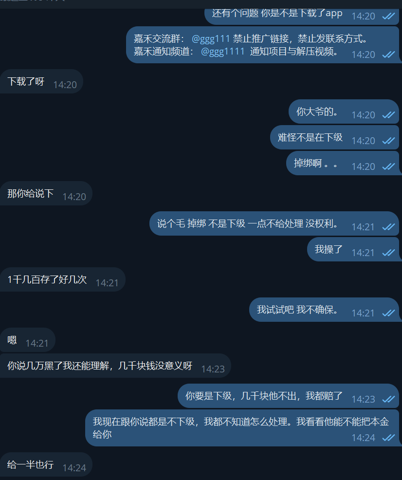 掉绑是我的问题吗?他们操作的,就几千块都处理不了,你们站长是干嘛的?下次别人被黑几千上万的你们的一句话不是下级怎么处理也就完事了吗?跟你们嘉禾玩了这么久了,属实没想到几千都处理不了,