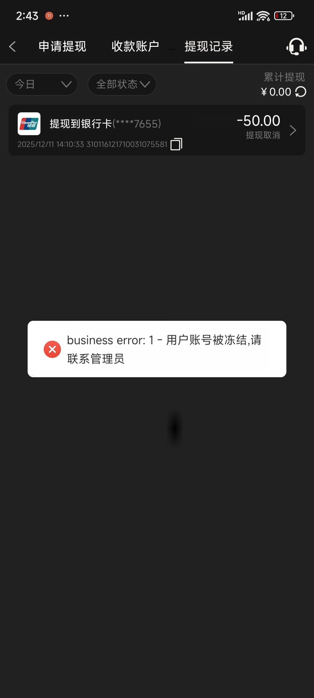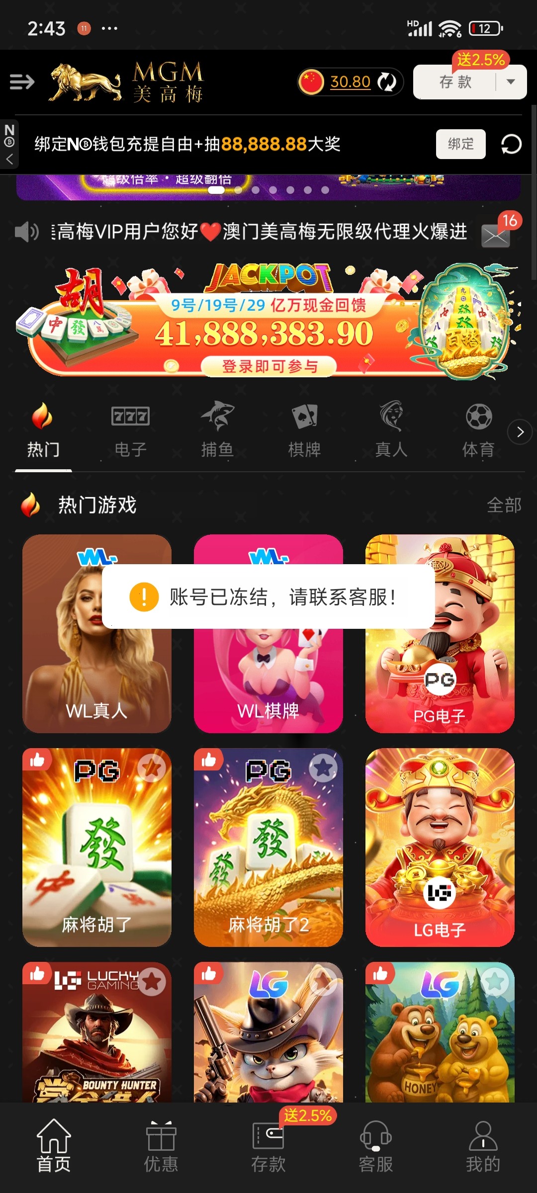 今天给我发短信了,登录上去有3块钱,麻1一块一拉,给了80块,尝试提50块直接黑,冻结账户,大家避雷!